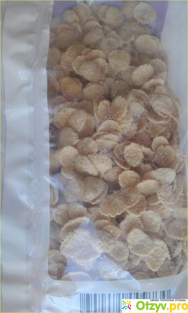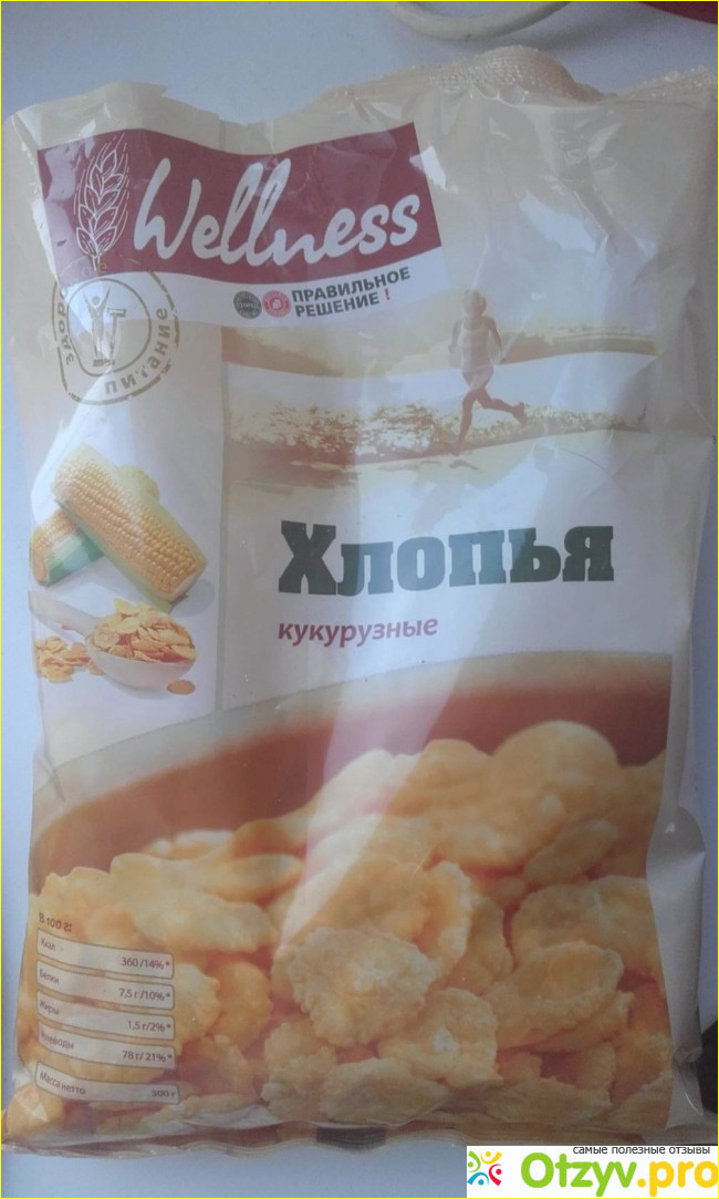 Упаковочка у Кукурузных хлопьевWellness прозрачная, всегда видно, что хлопья не раздавлены, цельные, нет осадка в виде крошек, как иногда бывает впакетах с хлопьями.