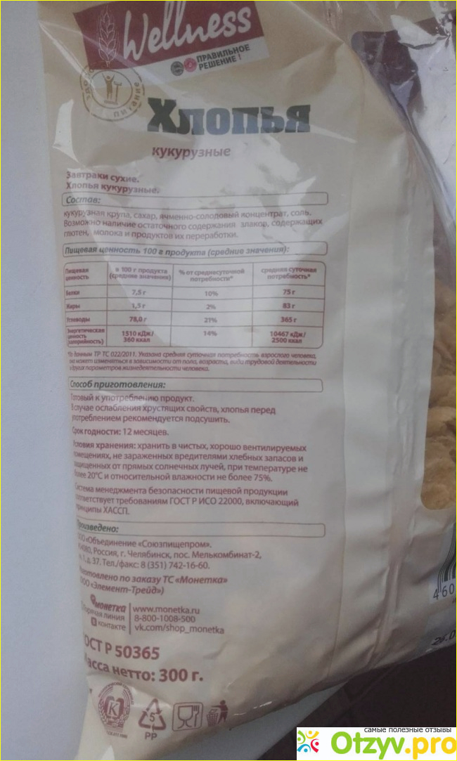 Изготовитель ООО Объединение Союзпищепром, нам широко известен, как поставщик качественных макаронных изделий и сухих завтраков. Находится производитель в г. Челябинске, а эти кукурузные хлопья изготовлены по заказу Торговой сети Монетка.
