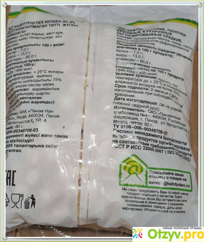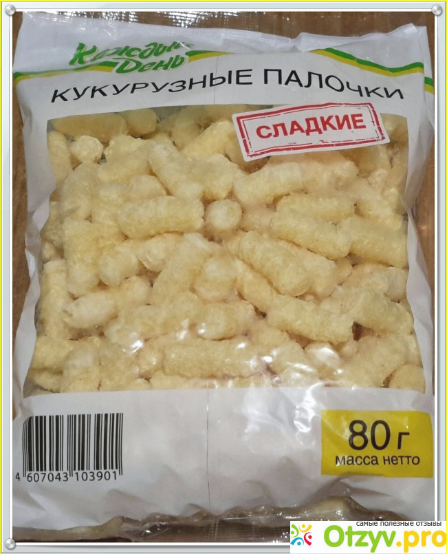 Кукурузные палочки аккуратно уложены в целлофановый пакет, плотно запечатанный. На обратной стороне упаковки, написаны все необходимые сведения об этом продукте.