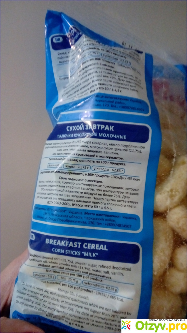 Состав эти кукурузных вкусняшек отличный, безопасный даже для деток. Основа палочек это кукурузная крупа, также есть сахар, сухое молоко, подсолнечное масло и ещё несколько безопасных добавок.