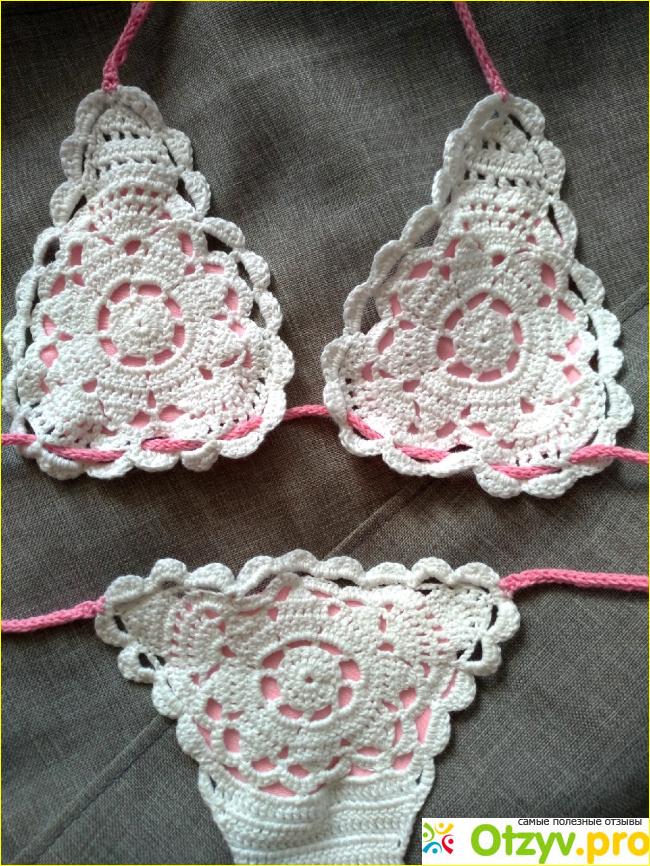 Качество пряжи на высоте. Розовая подкладочка приятна к телу и пришита очень аккуратно. Крупные дырочки дают возмонжность телу дышать, несмотря на то, что сам купальник вязаный. На фигуре сидит отлично и хорошо подчеркивает грудь и талию.