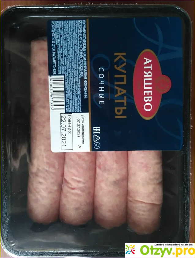 Уже не первый раз беру домой купаты сочные от производителя Атяшево, в этот раз решила оставить отзыв. Купаты продают наверное во всех магазинах, я покупала в Ашане, Магните, Пятёрочке и последний раз брал в Ленте, по цене везде примерно одинаково стоят 100-120 руб. Они продаются охлаждёнными в упаковке 400 грамм, это 4 колбаски.