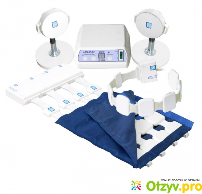 Это магнитотерапевтический аппарат для индивидуального использования в домашних условиях. Представляет собой конструкцию из регулятора и шнура, а также цепи специальных пластиковых блоков, к которым подключается магнитная катушка. Когда они работают, то цвет индикаторов меняется.