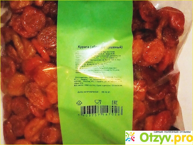 Эта курага изготовлена на ООО "Экофуд", Татария, город Казань. Это как может быть? Ведь абрикосы в Татарии не выращиваются. Упаковка прозрачная, невзрачная такая. А курага смотрится симпатично, на ощупь мягкая. Вся информация- вот на этой зеленой вертикальной полосе, что есть на пакете. Очень мелкий черный шрифт на зеленом фоне. Будто специально так печатают, что и не разглядишь ничего. Ищу информацию о том, откуда продукт привезен. Из Таджикистана. Значит, везут абрикосы в Татарию, а там высушивают и фасуют. А может, только фасуют.