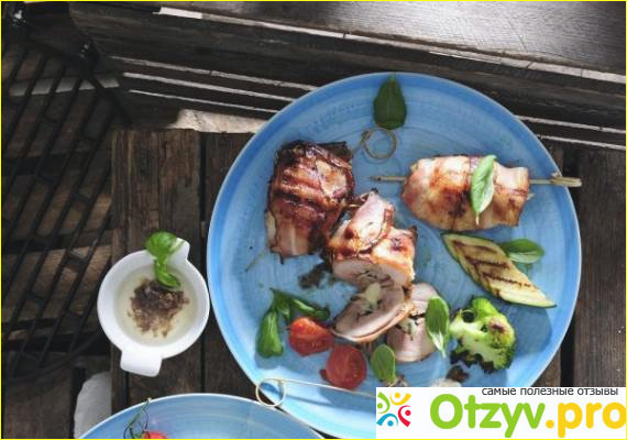 Завернуть ломтиком бекона и наколоть на шпажки для шашлыков. Посыпать свеже молотым перцем. Разложить на решетке и готовить на гриле 15-20 минут, часто поворачивая. Подавать с овощами приготовленными на гриле.