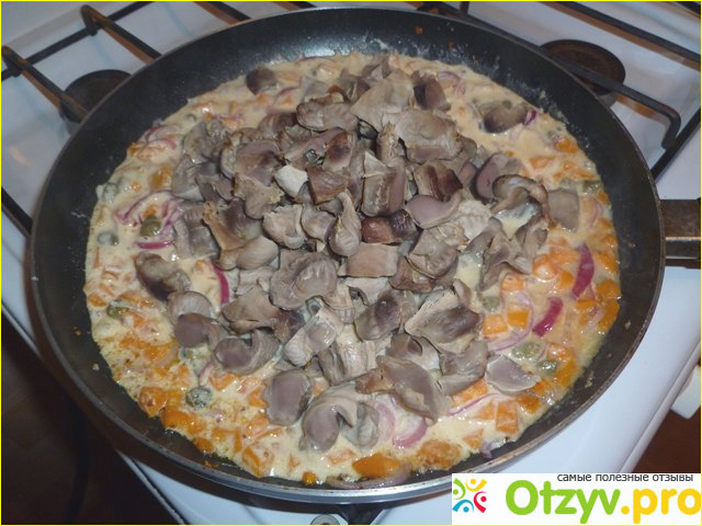 проверяем желудки (должны свариться именно они - сердца варятся быстрее гораздо), если нормально жуются - чистим. режем оставшуюся луковицу - высыпаем, тушим минут 10-15, сливаем воду (по возможности всю) и заливаем сметанным соусом (тушим еще 10-15 минут(можно и дальше, желудки временем не испортишь)), посыпаем остатками зелени, добавляем любой гарнир (пюре, рис, макарона) - и бона пити