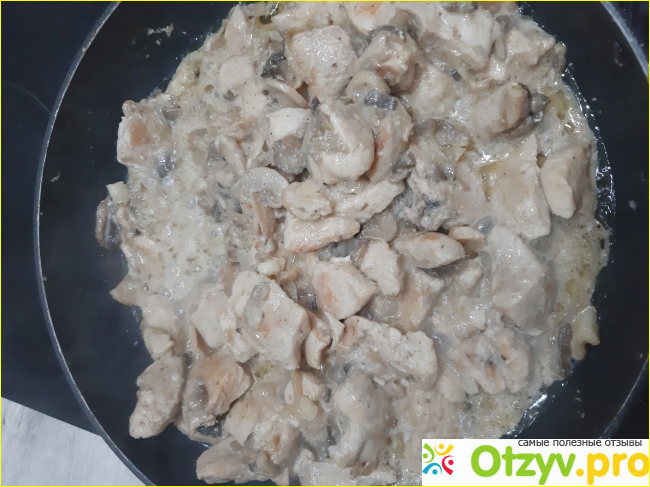 После того как все ингредиенты добавлены, тушим все до готовности под крышкой, пока не выпарится жидкость. Следующим шагом добавляем в сковороду сметану, перемешиваем. Добавляем соли при необходимости.