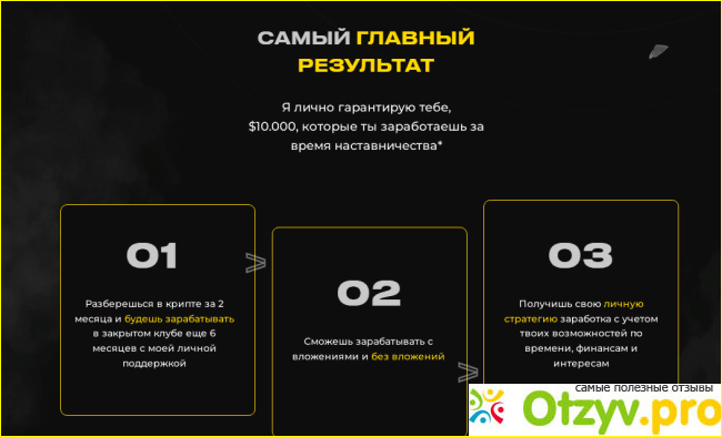 Здесь нас научат разбираться из чего состоит рынок криптовалют, по каким законам он работает. Разбираться во всех экономических тонкостях, узнать – почему цена на криптовалюту то падает, то растет. Понимать психологию финансового рынка, научиться извлекать из этого пользу. Поможет разобраться во всех тонкостях, информационных ресурсах, научиться читать и понимать все о крипте, держать руку на пульсе. Предлагает два тарифа: тариф “Гарант” и тариф “Результат”, все подробности можно узнать на его официальном сайте. В тарифе ГАРАНТ они работают с тобой 1 на 1. В тарифе РЕЗУЛЬТАТ уже есть общий закрытый чат, где он отвечаю на все вопросы, а также проводит разборы в формате регулярных видеозвонков. Начинать можно с любой суммы. Рынок криптовалюты позволяет сделать капитал из любой суммы. Подробнее об этом ты узнаешь на наставничестве. Сколько длится курс? Курс состоит из 8 модулей, на его прохождение потребуется 2 месяца + 6 месяцев практической работы в закрытом клубе. Доступ открываем сразу после оплаты.