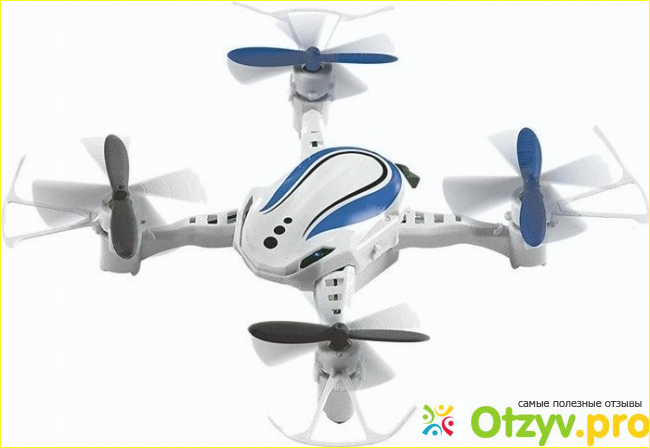 Корпус и рама сделаны из пластика. Тут нет складного шасси и камеры. Имеются навигационные огни. Управляется вещь с пульта. Который нужно сказать больше того квадрокоптера. Для пульта нужно заранее купить батарейки ( в комплекте их нет). Сигнал передачи идет через радиоканал. Наш цвет бело-синий. Установлен электрический двигатель коллекторного типа. Пропеллер двухлопастный. По количеству каналов управления, четыре. Радиосвязь на пять метров. Относительно зарядки аккумулятора, должен заряжаться тридцать минут и пять минут ему полета. Аккумулятор Li-pol.