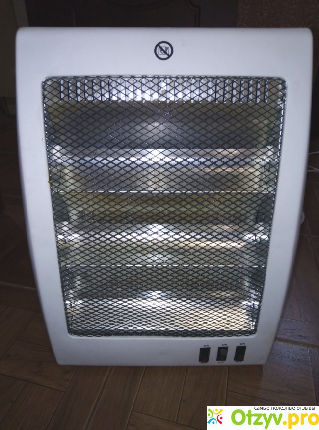 Лампы накаливания защищены металлической решеткой. При обгорании естественно начинает издавать определенный запах, но не съедает воздух, а просто небольшой перегрев поверхности. Сильно, быстро перегревается. Корпус пластиковый, белого цвета.