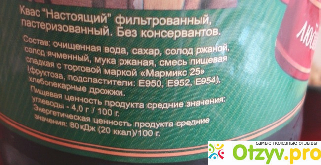 Теперь, что касается состава. Несмотря на то, что квас изготовлен по ГОСТу среди ингредиентов имеются подсластители, а именно Е 950, Е 952 и Е 954.
