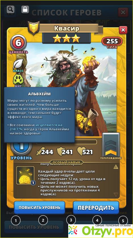 Когда срабатывает навык у каждого союзника возникает пчела. У неё 15% здоровья и 18% атаки героя. Этот миньон наносит 32 урона от яда в течении двух ходов. Цель пчелы не может получать полезных миньонов в следующие четыре хода. Мой Квасир пока не прокачан, но я искренне убилась об героя команды соперника во время трёхзвёздочного турнира. А помог мне в этом фуловый жёлтый герой оппонента.