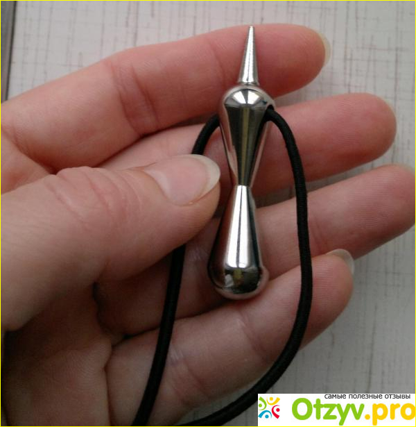 Своим внешним видом приборчик меня не особенно впечатлил: это металлический кулончик на шнурке-резинке с одевающимся на него заостренным наконечником для дополнительной акупунктуры.