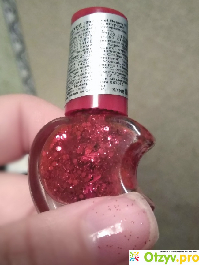 Затем я заметила, что в магазин подвезли новую партию лаков и купила красный в виде точек и звёздочек в прозрачной основе. Первое нанесение оказалось практически незаметным. На ногтях оставалось совсем мало красненьких точек, но высыхал он мгновенно.