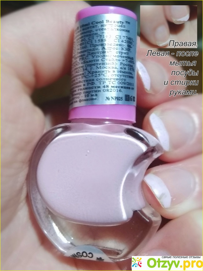 Нанесла розовый лак только на кончики ногтей и покрыла лаком-сушкой. На ногтях держится вполне приемлемо. Посуду я мою без рукавичек, а потому любой маникюр уходит сразу. Этот выжил. На левой руке лак даже пережил стирку руками (вещей по объёму около ведра битком), а на правой смылся полностью или откололся частями. Но я его, конечно, не виню, нагрузка на него была колоссальная.