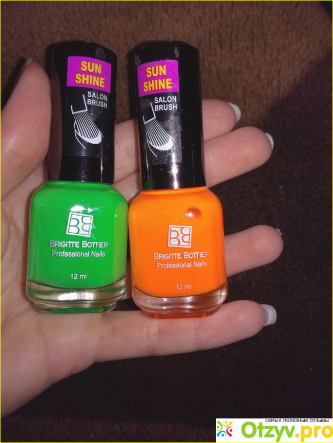 Желтые цвета, как правило, оказываются блеклыми, после нанесения появляется скорее эффект прокуренных ногтей, чем по-летнему яркий цвет, но лак Brigitte Bottier не разочаровал, и я скупила почти всю предлагаемую палитру - оранжевый, салатовый, голубой, фуксия и еще что-то между оранжевым и красным, то есть такой «насыщенный персик», потому что мне было интересно попробовать все цвета. Зеленый тоже не подвел, я его очень люблю, он освежает и делает ногти необычными, броскими, притягивающими внимание. Ложится лак достаточно неплохо, не хуже других. По стойкости тоже, как все - дня 3-4 можно с ним проходить. Снимается очень легко, никуда не затекает. В темноте, правда, не светится, но для своей цены обладает всеми необходимыми свойствами. Стоит приблизительно 150 - 170 рублей. На фоне дорогих лаков рублей по 500 - 600 и даже больше это вообще превосходно. Так что если хотите дополнить свой образ капелькой настоящей яркости, очень рекомендую этот лак.