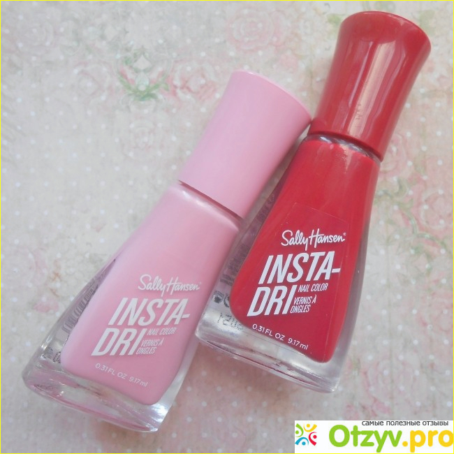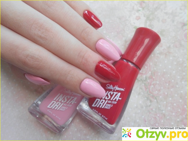 Лаки Insta-Dri от Sally Hansen – это новая улучшенная формула предыдущего поколения, которая обеспечивает лучшую стойкость маникюра по сравнению со старой формулой. Производитель заявляет, что это однослойное покрытие, которое сохнет 60 секунд. На данный момент в линейке около 50 оттенков. Цвета видны на самом флаконе. Есть как названия, к примеру, Rapid Red, Pink Blink, так и номера. Объем флакончиков – 9,17 мл. К удивлению, впервые вижу неровный объем. Возможно, дело в изяществе бутыльков. Цена не высокая – около 300 рублей.
