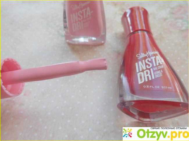 У данных лаков очень длинные кисти. Не сам ворс, который, впрочем, слишком толстый (не позволяет близко подобраться к кутикуле), а стержень. Из-за этого очень тяжело красить, поскольку слишком трудно контролировать движение щетины и нажим на нее. Ведь все наши усилия руки сосредотачиваются на колпачке, а далее переходят ниже. Чем короче стержень у кисти, тем ловчее получаются скольжения кисточкой. Еще один минус – это время сушки. Заявленная минута не выдерживается. Сохнут лаки как любые другие. У меня есть лачки других фирм, которые высыхают куда быстрее. Кстати, некоторые цвета, например, Rapid Red, могут окрашивать ногтевую пластину. Видимо, слишком сильный пигмент.
