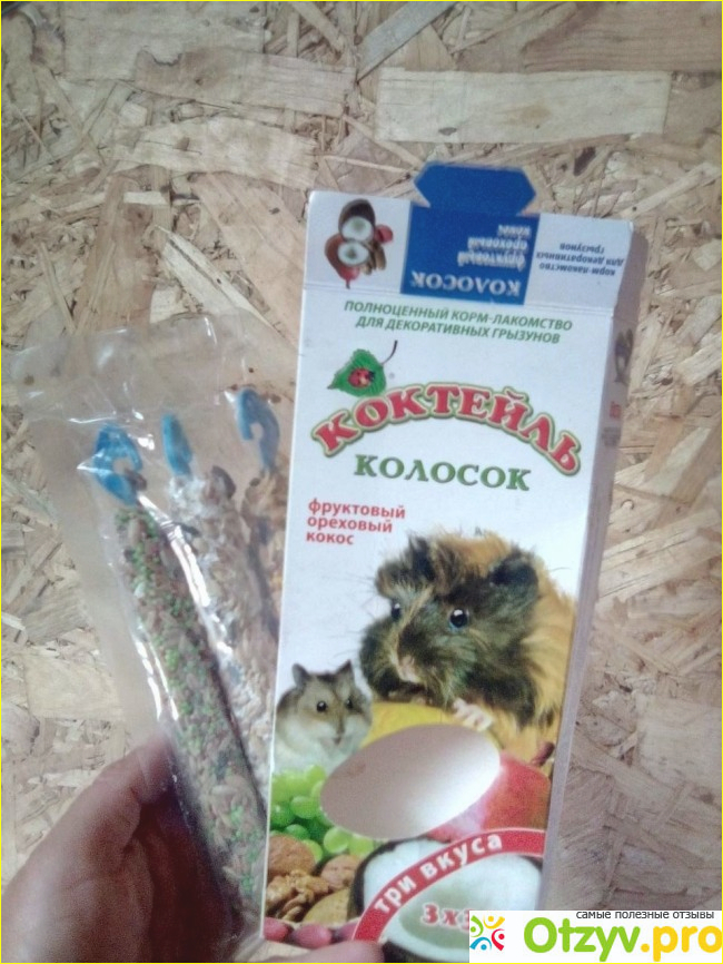 Лакомство для грызунов позволяет им стачивать зубки, т. к. основа под зернами сделана из дерева.