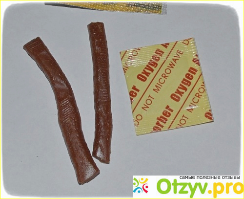 В маленькой герметичной упаковке лежат две тоненькие колбаски, сантиметров по 5 в длину каждая. Вместе с ними лежит еще крохотный желтый пакетик с неким веществом, предполагаю, что это что-то от сырости.