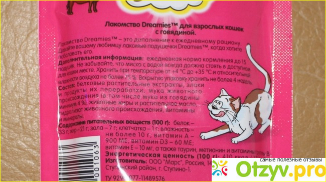 Не говоря уже об обычных человеческих вкусняшках. В общем, как ребенок - подавай все покупное и в шуршащей красивой упаковке. Я покупаю ей дорогие корма. Но всегда одни и те же... Поэтому они ей приедаются и со временем начинает просить что-то лакомое. Вот решила для разнообразия купить ей, так называемое лакомство "с говядиной" марки Dreamies. Продается практически во всех супермаркетах. По цене вроде не накладно. Но в упаковке мало корма.