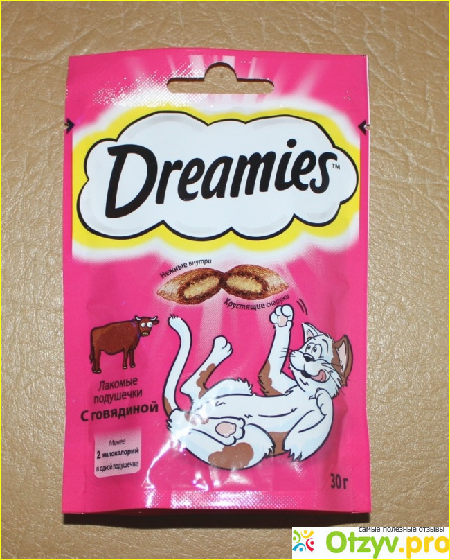 Лакомые подушечки Dreamies с говядиной я иногда покупаю кошке. Она у нас старенькая уже, ей уже 13 лет - член семьи, моя подружка. Всю жизнь она на специальных кормах для кошек, к обычной еде со стола не проявляет интереса, изредка может попросить кусочек мяса и то съест один и уже от второго откажется.