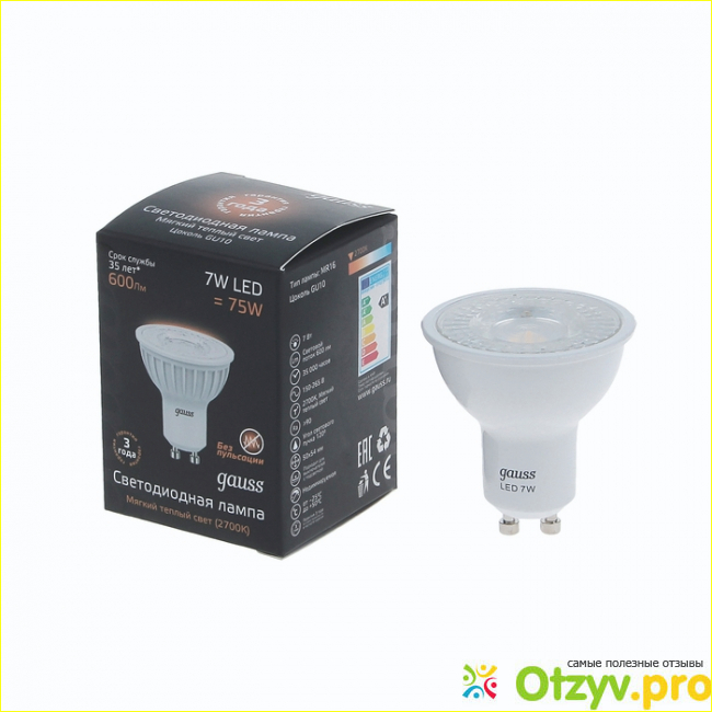 Подбирали с женой софиты для подсветки зеркала и шкафа в спальне и увидели это вариант. Светодиодная лампа Gauss LED MR16 GU10 подходит для использования в сети 220 V, а мощность 7 W является прямым аналогом галогеновой лампы мощностью 75 W, что позволяет значительно экономить на потреблении электроэнергии и говорит об её эффективности и экологичности. Заявленный срок службы 35 лет, но это если не жечь постоянно свет, а экономно расходовать.
