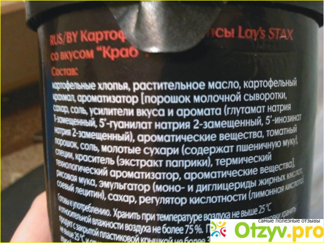 Чипсы на внешний вид напомнили принглс, всё то же самое, форма, размер. Но вот вкус меня разочаровал. Вкус отличается от вкуса Лэйс с крабом в обычной упаковке, но, на мой взгляд, в худшую сторону. Более химический и сильный. Состав показан на фото, но, думаю, не стоит изначально искать что-то хорошее в составе чипсов.
