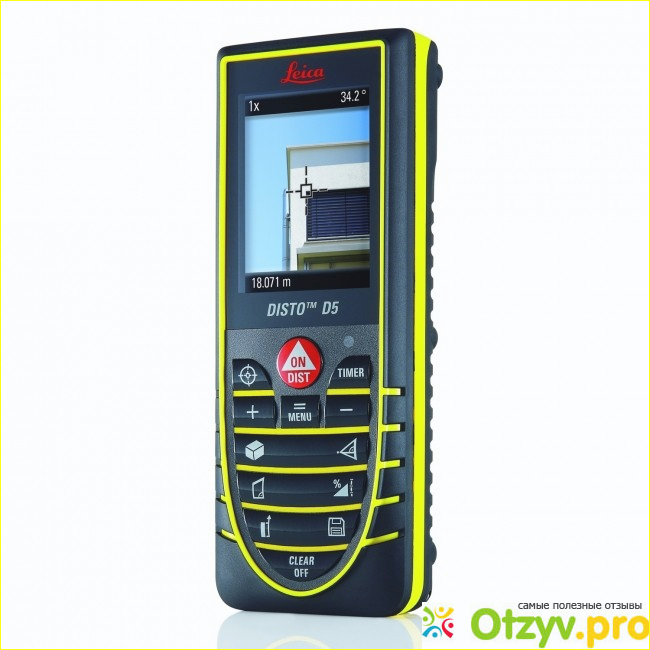 Для управления дальномером на нём есть специальные кнопки, они изготовлены из глянцевого пластика черного цвета, что их хорошо выделяет на самом корпусе дальномера. На корпусе дальномера имеется цветной ( 2,4 дюйма, 50 х 37 мм.) жидкокристаллический дисплей. Показатели измерения на данном дисплее показываются достаточно крупными цифрами и хорошо читаются. Высокое разрешение экрана обеспечивает удобство в работе даже при ярком солнечном свете. Питается данный прибор от двух пальчиковых батареек типа ААA -1,5В (в комплекте имеются), которых хватает на достаточно приличное время, где-то на пять тысяч измерений. Корпус дальномера имеет специальную подставку, при помощи которой данный прибор можно поставить на любую поверхность, также имеется специальное крепление для штатива (штатив в комплекте отсутствует ). Если говорить о комплектности данного прибора, то в неё входят: картонная упаковка, сам прибор (лазерный дальномер), две пальчиковые батарейки типа ААA -1,5В, матерчатый чехол черного цвета. Кстати, чехол сшит довольно добротно, очень крепкий, его можно вешать на пояс брюк, для этого на нём есть специальное крепление. В комплекте есть ещё и специальный ремешок при помощи которого его можно носить на кисте руки ( вес дальномера – 195 грамм), что очень даже удобно Ну, а теперь о самом интересном и главном – о возможностях данного прибора. Дальномер оборудован видеокамерой прицелом с 4-х кратным увеличением, что позволяет очень точно измерить расстояние до 200 метров (минимальное измеряемое расстояние измерения – 0, 05 метров). Этот прибор является многофункциональным, при помощи его можно измерить не только расстояние между двумя точками (объектами), но и измерить углы при помощи датчик уклона, можно также без труда определить площадь потолка или стены, а также определить площадь или объём измеряемого помещения. Программное обеспечение дальномера DSTO D5 позволяет вычислять не только объем и площадь необходимых Вам помещений, но и площади трапеций , а также определять площадь помещений сложной конфигурации путем деления на треугольники. Всё это далеко не полный перечень его возможностей. Не может не радовать и его точность, погрешность данного прибора составляет всего-навсего ± 1 мм. Конечно, данный прибор немного сложноват для обыкновенного пользователя, но если вы его хорошо изучите, то поймете, что ему просто цены нет. Мои выводы: Лазерный дальномер Leica Disto D5 является отличным измерительным прибором, который не только измерит для вас нужное расстояние, но ещё и произведет необходимые для вас расчеты. При этом им очень легко пользоваться даже одному человеку в отличии от обыкновенной рулетки, особенно при измерении большого расстояния, когда нужна элементарная помощь второго человека. Страна производитель данного прибора заслуживает уважения – это Венгрия, срок гарантии данного прибора 30 месяцев, то есть три года.