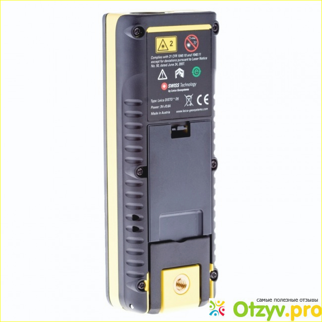 Сам лазерный дальномер Leica Disto D5 по своему внешнему виду чем-то похож на кнопочный сотовый телефон, только чуть по размерам поболее. Размеры его корпуса следующие: длина – 143,5 мм, ширина – 55 мм, толщина – 30 мм. Корпус дальномера изготовлен очень добротно, качественно и красиво. В корпусе преобладает черный цвет с желтыми вставками, основная же кнопка же ON красного цвет. Чувствуется, что при разработке его внешнего вида поработали хорошие дизайнеры, внешне он получился симпатичным, привлекательным и очень удобным для пользования. Ко всему сказанному, корпус дальномера имеет влаго и пыле защиту, что немаловажно при использовании на улице. Корпус сам по себе прорезиненный и матовый, что делает его очень удобным, чтобы держать его в руке. Корпус данного дальномера в чем-то даже уникальный, он изготовлен из высококачественного композитного материала. Этот материал сам по себе очень легкий и обладает высокой прочностью - прочностью металла, абсолютно не подвержен деформации при резких изменениях температуры. Всё это говорит о высоком уровне изготовления данного прибора.