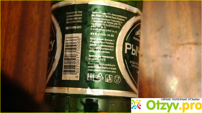 На этот раз мы для праздничного стола приобрели данный напиток в пластиковой бутылке объемом 1 литр. Изготовителем данного напитка является наша страна Россия, Республика Дагестан, ОАО Завод минеральных вод «Рычал-СУ». Пластиковая бутылка темного цвета, с удобной отвинчивающейся крышкой. На бутылке имеется круговая этикетка, на которой есть вся необходимая информация для покупателя.