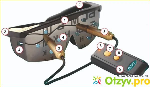 Очки оснащены регуляторами со светодиодами, с обратной стороны встроены провода, которые обеспечивают связь с блоком управления. Положительное воздействие очков достигается квантовой светоимпульсивной терапией, и магнитной терапией. Есть возможность изменять частоту мигания и цветоимпульсивность - это вам расскажет и пропишет доктор. В любом случае, перед использованием аппарата, нужна консультация врача.