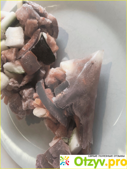 К сожалению, не удалось оценить вкусовые качества лечо Мираторг. Потому что овощи внутри пакета слиплись в ледяную массу. Я не стала терять свое время и ждать их разморозки. Да и посомневалась, что после этого они сохранят свои вкусовые качества.