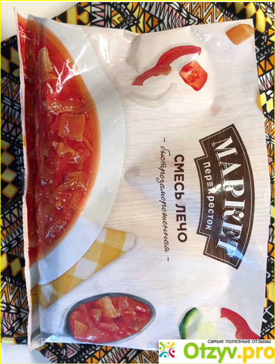Маркет Перекресток - новая для меня марка. Овощи и другие продукты у них я никогда не покупала. Но вот меня смутило то, каким показано готовое блюдо на упаковке - то ли это недоваренный борщ, то ли щи, в которые добавили слишком много томата. Но на лечо не похоже.
