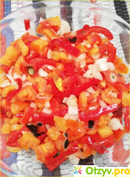 Рассматривая пачку, мне показалось, что смесь состоит из 4 ингредиентов - лука, перца, помидора и чего-то зеленого, похожего на плоскую стручковую фасоль. Но на деле там только 3 овоща, а что они имели в виду, нарисовав эти зеленые кусочки, я так и не поняла.