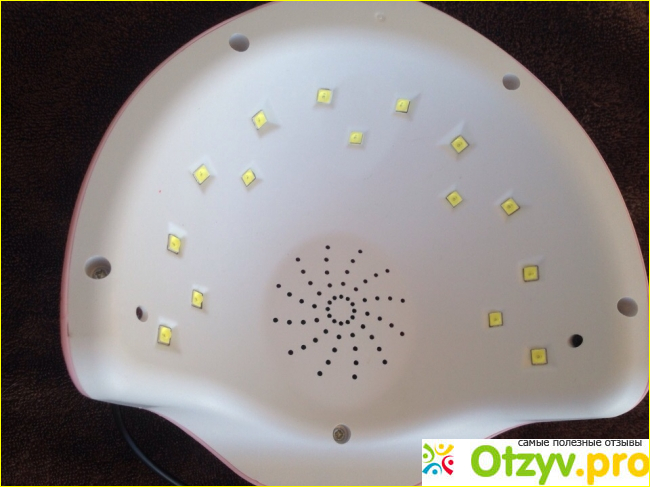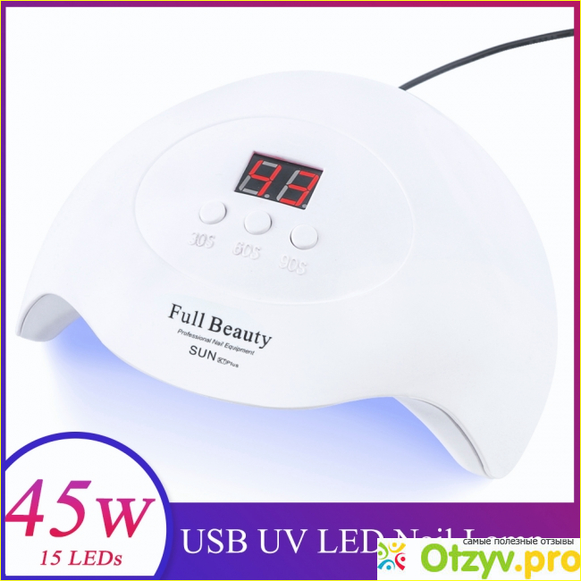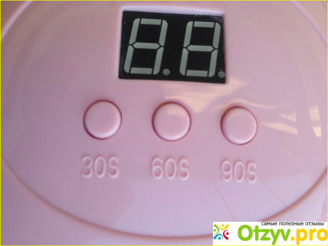 Сверху, расположены таймер и три кнопки на 30, 60 и 90 секунд работы. При поднесении руки к светодиодам, расположенным внутри, лампа автоматически включается и через 100 секунд отключается. Для высушивания одного слоя лака, достаточно 30-ти секунд.