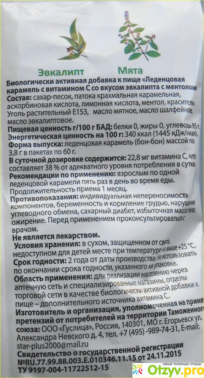 2. Леденцы Эвкалипт и МентолЧаще всего в такой форме выпускаются БАД-ы для лечения заболеваний горла и верхних дыхательных путей, как эти, содержащие ментол, мятное, эвкалиптовое и шалфейное масла, а также аскорбиновую кислоту. В данных конфетках нет ни белков, ни жиров, но много углеводов - 85%, это надо учитывать тем, кто страдает сахарным диабетом, имеет избыточный вес, беременным и кормящим грудью женщинам. Всем остальным, особенно деткам, не стоит воспринимать эти леденцы как сладость, которой можно одновременно и полечиться, и утолить голод. В день рекомендуется употреблять не более 5 конфеток, чтобы не было передозировки сахара и витамина С, которые попадают в наш организм и с другими продуктами.