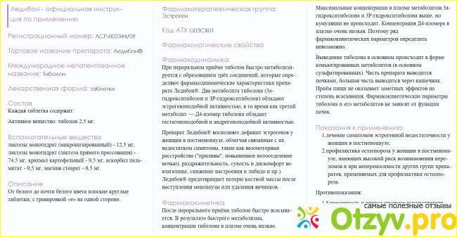 Действующее вещество Ледибона - Тиболон, выпускается в таблетках белого цвета, производитель Чехия. Удобная упаковка позволяет принимать таблетки по дням недели, 1 шт. в день, запивая водой. Пропускать прием Ледибона, не желательно, но в я пару раз просто забывала выпить, побочек не было.
