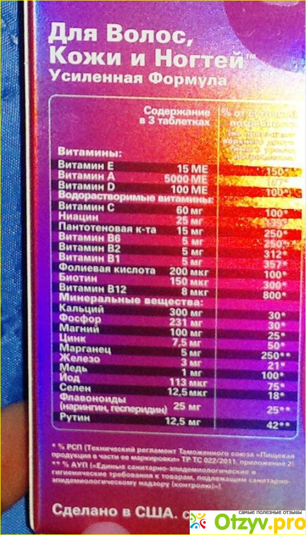 Принимала не по инструкции, так как упаковки хватает всего лишь на 20 дней, если принимать как указано по 3 шт в день, а я принимала одну утром и одну таблетку вечером. В составе их много кальция, фосфора и фолиевой кислоты. Состояние моих волос после трёх недель приёма этой добавки стало заметно лучше, стали более послушными, легко расчесываются и появился блеск волос. Кожа ногтей стала меньше слоится и ногти стали меньше ломаться и на вид стали здоровее. Стоимость этих витаминов для меня дороговата, поэтому как рекомендуется в инструкции сделать перерыв в 10 дней, а затем продолжить приём этих витаминов я не сделала. Однако даже за неполный курс приёма этих витаминов я увидела результат и мне он понравился. В целом не плохие витамины, но дороговаты. Фирма производитель их США.