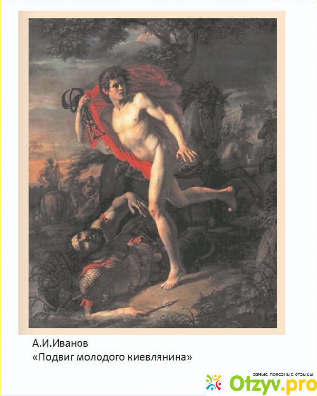 Воевода же решает перехитрить печенегов, говоря, что является воином Святослава и руководит небольшим передовым отрядом, а за ними идет вся многочисленная княжеская дружина.
