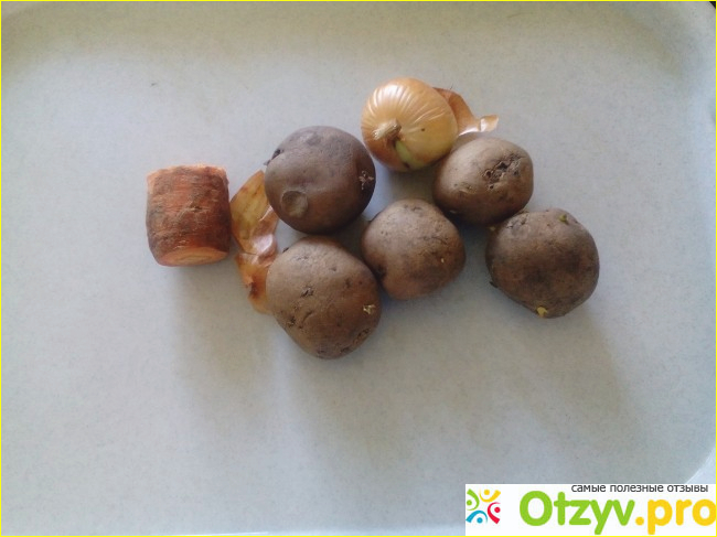 Нам понадобится традиционный набор продуктов: одна луковица, три - четыре картофелины. 1/3 часть большой моркови или одна маленькая.