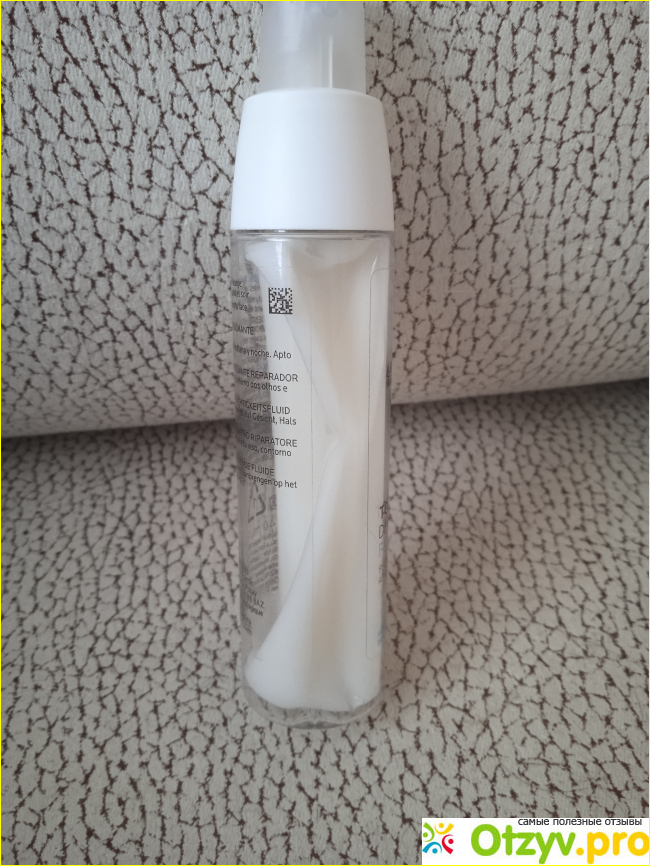 Такой формат я раньше не встречала. Крем находится не в самом флакончика, а в дополнительном вакуумном пакетике, во мере использования средства - пакетик сжимается. На фото это видно, изначально бутылек был полностью белого цвета.