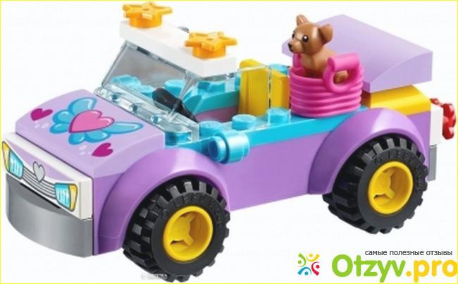 Для того, чтобы попасть на пляж главному герою необходимо заполнить до краев свой шикарный кабриолет всем тем, что может пригодиться на пляже. Но сперва ребенку нужно собрать машину, это делать очень легко благодаря понятной инструкции. Машина выходит очень яркого и красочного цвета-фиолетовая с добавлением голубых деталей. Размеры автотранспорта в собранном виде составляют в длину примерно 10 см.