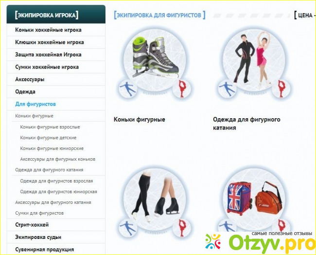 7) Далее идет специальный раздел "Для фигуристов". Здесь собрано все для них - и коньки фигурные, и одежда и сумки.
