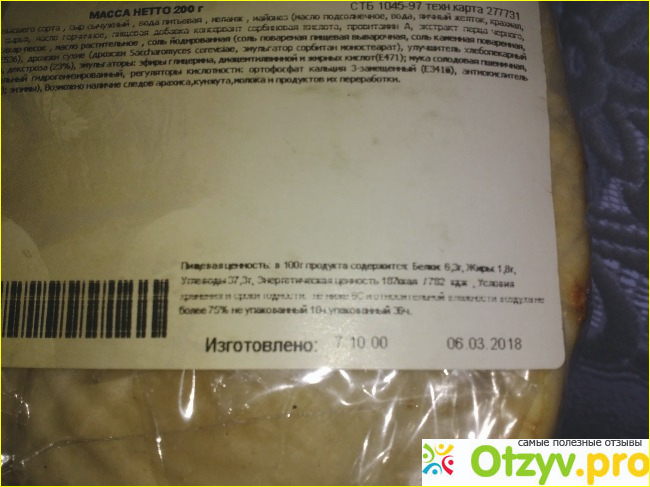 Вес стандартной лепёшки составляет двести граммов. Состав указан не совсем крупным шрифтом по центру бумажной этикетки. В составе меня, в принципе, всё устроило, за исключением одного-единственного компонента - антислеживающего агента с индексом "Е". Ешки не хотелось бы употреблять в пищу. Но здесь я нашла только одну добавку с таким индексом. Сделала фотографию информации о составе продукта, чтобы читатели отзыва смогли самостоятельно с ней ознакомиться.