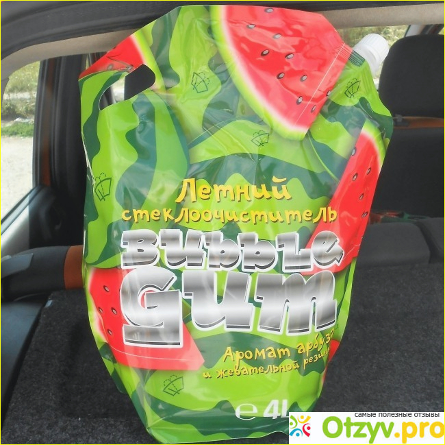Кроме отличных моющих свойств этот Стеклоочиститель Bubble gum еще и обладает очень приятным ароматом арбуза и жевательной резинки. Это, надо сказать, весьма оригинально и всем нравится. Когда мы подвозим наших родственников и знакомых и моем при них ветровое стекло, они всегда спрашивают, что это за жидкость, где мы ее покупали, сколько она стоит.