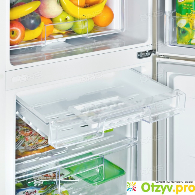 Общий объем холодильника составляет 303 литра, из них на холодильную камеру выходит 217 литров и 86 литров на морозильную камеру, не совсем то, что нужно, но все же продукты мне есть куда складывать. В плане обслуживания никакого геморроя, по системе No Frost размораживаются два отсека, без вашего на то участия. Есть функция суперзаморозки, есть индикация температуры, все это высвечивается на дисплее. Работает довольно тихо и это радует, не отвлекает нас от своих дел, компрессор работает отлично. Предусмотрен также антибактериальный уплотнитель, все полки внутри холодильной камеры изготовлены из стекла, достаточно количество дверных полок, лоток для яиц, ящики для хранения овощей и фруктов. В морозильной камере расположены ящики выдвижные, правда они не совсем удобные. Нету специальной формочки для приготовления льда.
