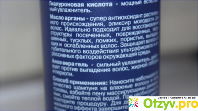 Содержит гиалуроновую кислоту. Сначала я обрадовалась этому обстоятельству, но не тут то было. Эффективность этого компонента в составе шампуня минимальна и кратковременна. А вот если воспользоваться маской для волос с гиалуроновой кислотой, то положительное воздействие увеличится в разы.