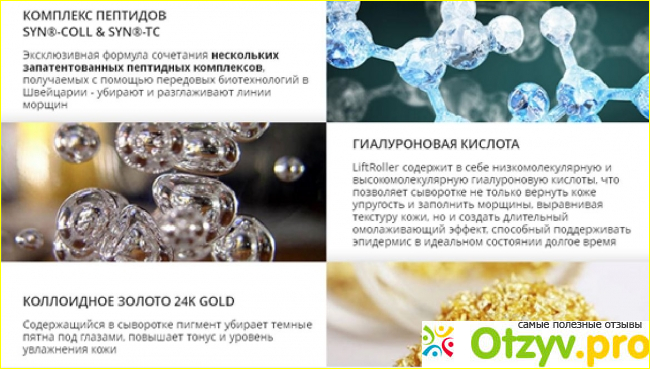 На самом приборе есть шарики, которые позволяют делать массаж, это оказывает эффект проводимости, что способствует более лучшей впитываемости активных компонентов сыворотки в кожу, при этом каждая клеточка наполняется необходимыми активными веществами. Благодаря тому, что в составе сыворотки есть комплекс пептидов, кислота гиалуроновая и пигмент золота, что позволяет увлажнять кожу, осветлять ее и омолаживать.