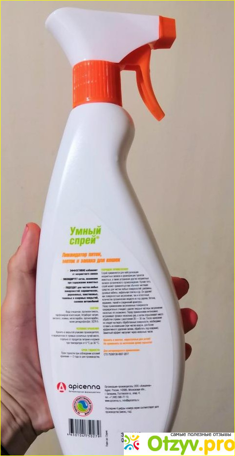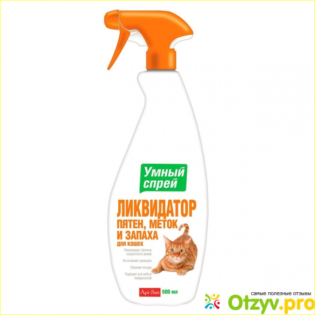 Обычно я справляюсь с мочой при помощи уборки при помощи обычной белизны. Справляется хорошо, но запах после этого дикий и сохраняется очень долго. Поэтому мне захотелось найти нечто менее ядреное, то что будет приносить мне меньше дискомфорта в процессе использования. Так я нашла спрей 5 в 1 Апи-Сан ликвидатор пятен, меток и запаха. 500 мл жидкости обойдется в 300 рублей. И за эти деньги производитель обещает потребителю устранение любых запахов и дезинфекцию. Процесс обработки очень прост. Достаточно убрать загрязнения и отходы с поверхности, после чего, с расстояния 20-30 см распылить спрей и оставить его до полного впитывания. Спустя час запах исчезнет.